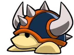Bumbleprod is a yellow turtle-like enemy with metallic, navy-blue and orange striped helmet-like shell with two sharp horns and spikes going along it’s top. It moves back and forth without attacking Wario but he will take damage if attempts to jump on it due to the spikes and sharp horns.